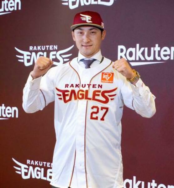 楽天の入団記者会見でユニホームを着てポーズをとる、DeNAから移籍した伊藤光=10日、楽天モバイルパーク宮城