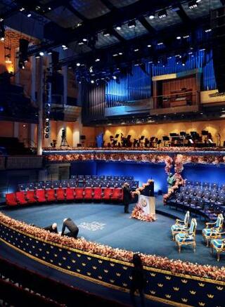 ノーベル賞授賞式の準備が進むストックホルムのコンサートホール=10日(代表撮影・共同)