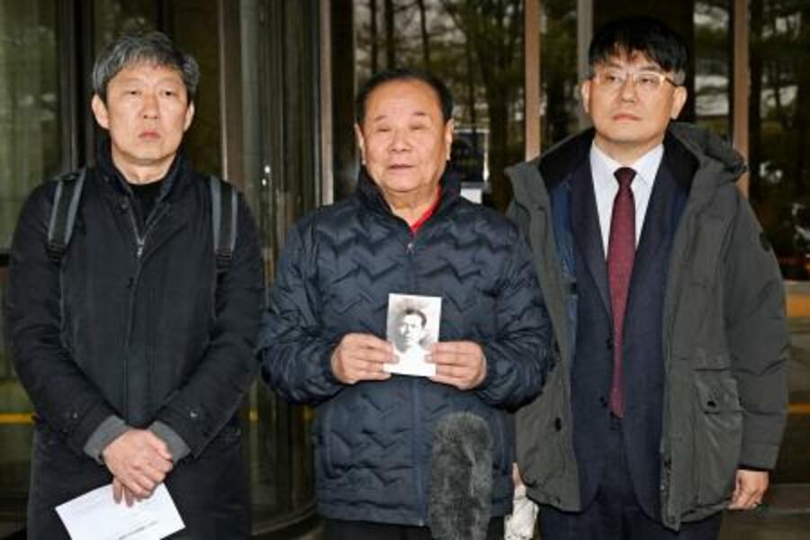 韓国最高裁の判決後、取材に応じる元徴用工の遺族(中央)ら=11日、ソウル(共同)