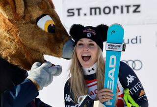 アルペンスキーW杯女子滑降、史上最年少41歳で通算83勝目を挙げ、表彰台でマスコットと喜ぶリンゼイ・ボン=12日、サンモリッツ(ロイター=共同)
