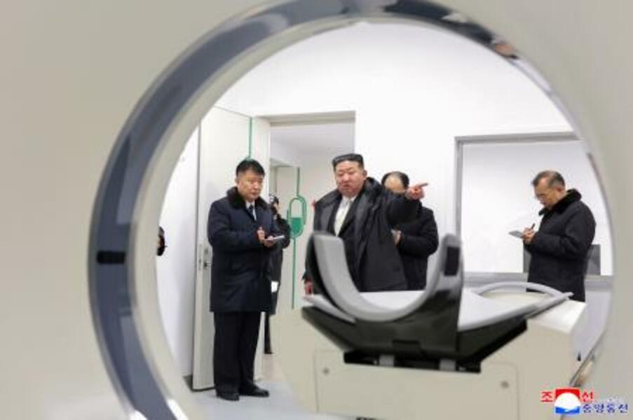 北朝鮮の北西部亀城で完工した病院を視察する金正恩朝鮮労働党総書記(中央)=13日(朝鮮中央通信=共同)