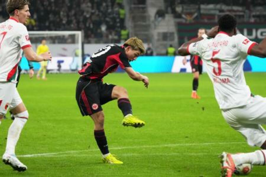 アウクスブルク戦で先制点を決めるアイントラハト・フランクフルトの堂安律(中央)=13日、フランクフルト(ゲッティ=共同)