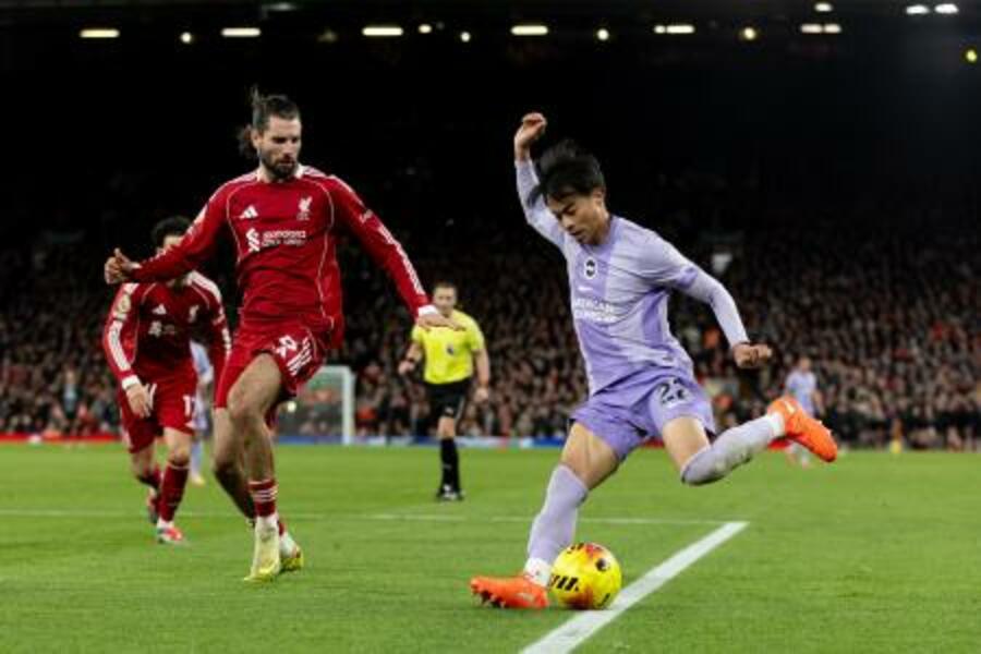 リバプール戦でプレーするブライトンの三笘薫(右)=13日、リバプール(ゲッティ=共同)