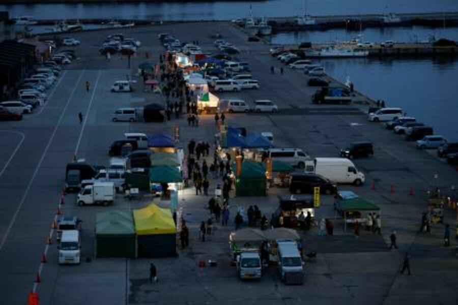青森県八戸市の「館鼻岸壁朝市」。出店数が限られ、敷地には空きが目立った=14日午前6時41分