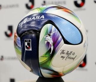 「キャプテン翼」の主人公、大空翼が描かれた、Jリーグ「百年構想リーグ」の公式試合球=16日午後、東京都千代田区