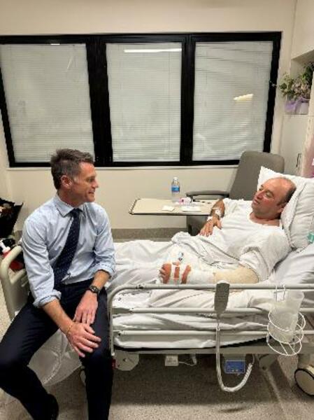 入院したアハメドさん(右)を見舞った州首相=15日、シドニー(州首相のXから、ロイター=共同)