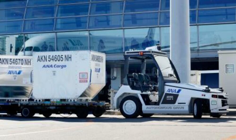 コンテナをけん引する全日空の無人トーイングトラクター=15日午後、羽田空港