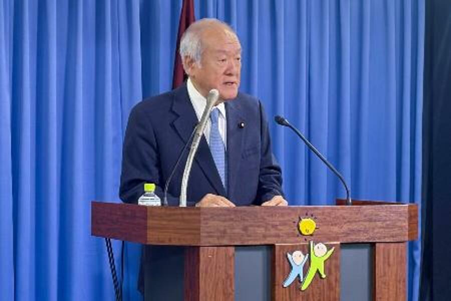 記者会見する自民党の鈴木幹事長=16日午前、東京・永田町の党本部