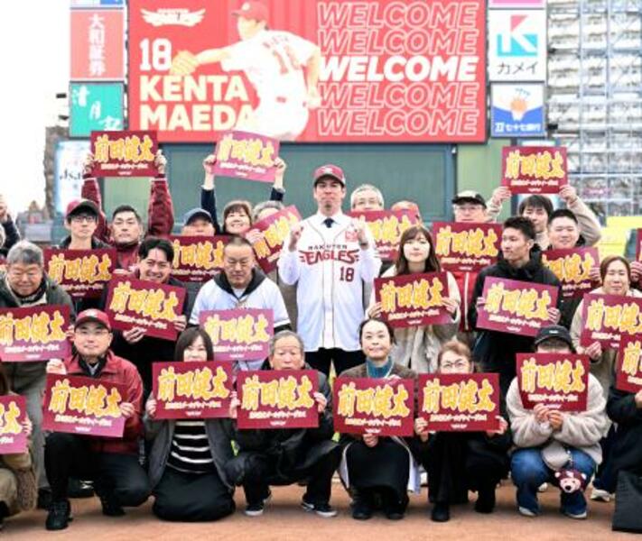 プロ野球・楽天に入団し、ファンと記念写真に納まる前田健太投手(中央)=16日、楽天モバイルパーク宮城