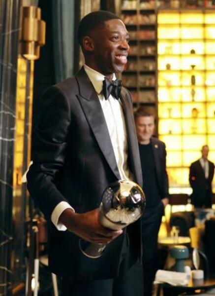 FIFAの男子年間最優秀選手に初選出され、表彰式で笑顔を見せるデンベレ=16日、ドーハ(FIFA提供・ゲッティ=共同)