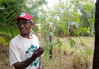 パッションフルーツのつるを手に農場の説明をするフィーリョさん=11月、ブラジル・モスケイロ島(共同)