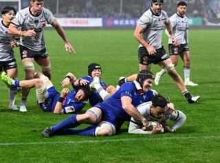 静岡―BL東京 後半、攻め込むBL東京・タマニバル(右下)。この後逆転トライを決める=ヤマハ