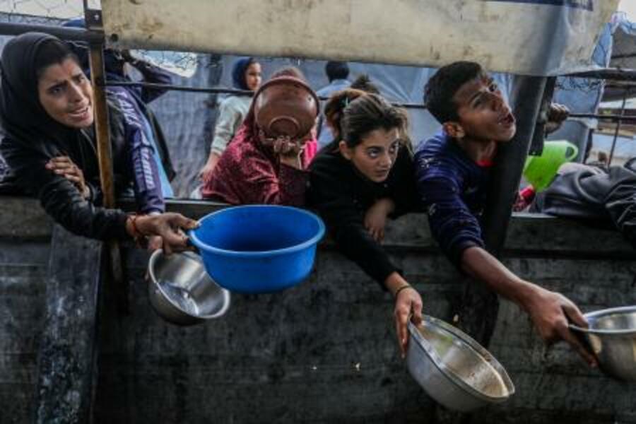 21日、ガザ南部ハンユニスで、食料を求め集まる人々(ゲッティ=共同)