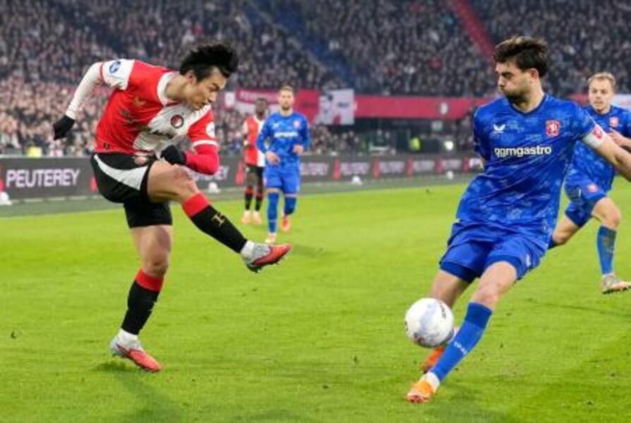 トウェンテ戦で攻め込むフェイエノールトの上田(左)=ロッテルダム(共同)