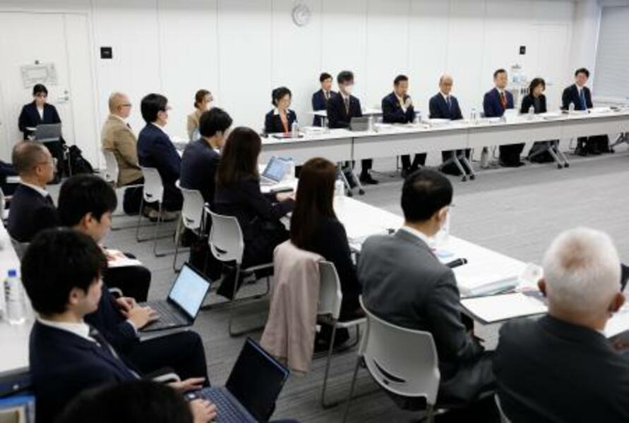 記者会見する公取委の担当者ら=22日午後、東京都港区