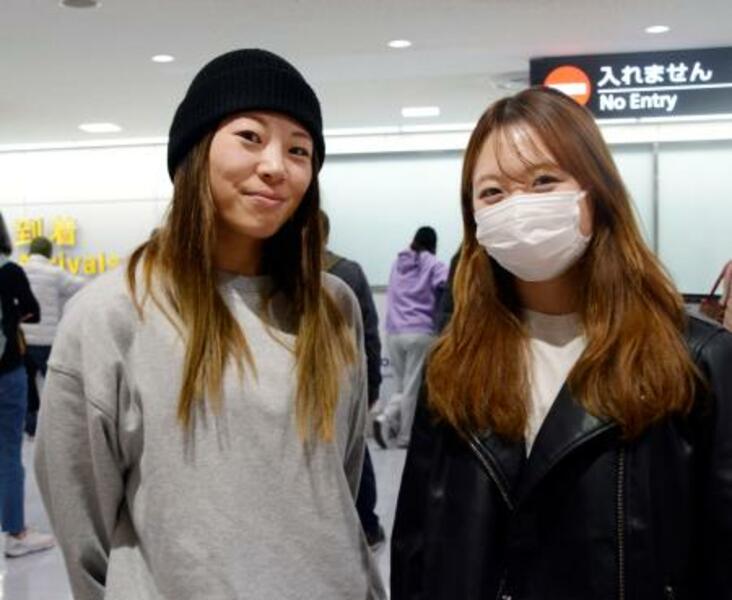 取材に応じるスノーボード女子の冨田せな(左)と工藤璃星=22日、成田空港