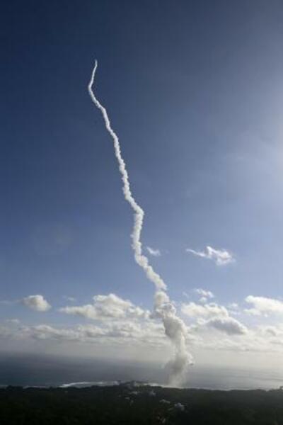 鹿児島県の種子島宇宙センターから打ち上げられたH3ロケット8号機が残した白煙=22日(共同通信社ヘリから)