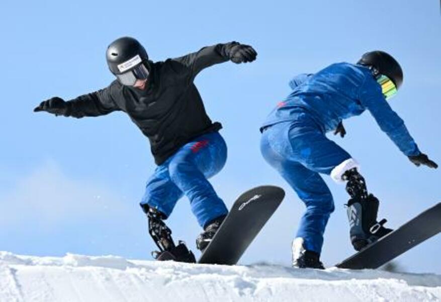 雪上で練習する小須田潤太(左)と小栗大地=静岡県裾野市