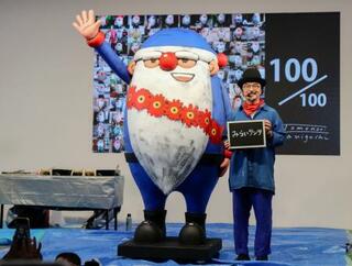 大阪・関西万博の会場で制作した「みらいサンタ」と谷口智則さん=9月、大阪市此花区の夢洲