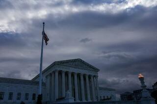 米連邦最高裁の建物の外ではためく米国旗=2024年12月、ワシントン(ロイター=共同)