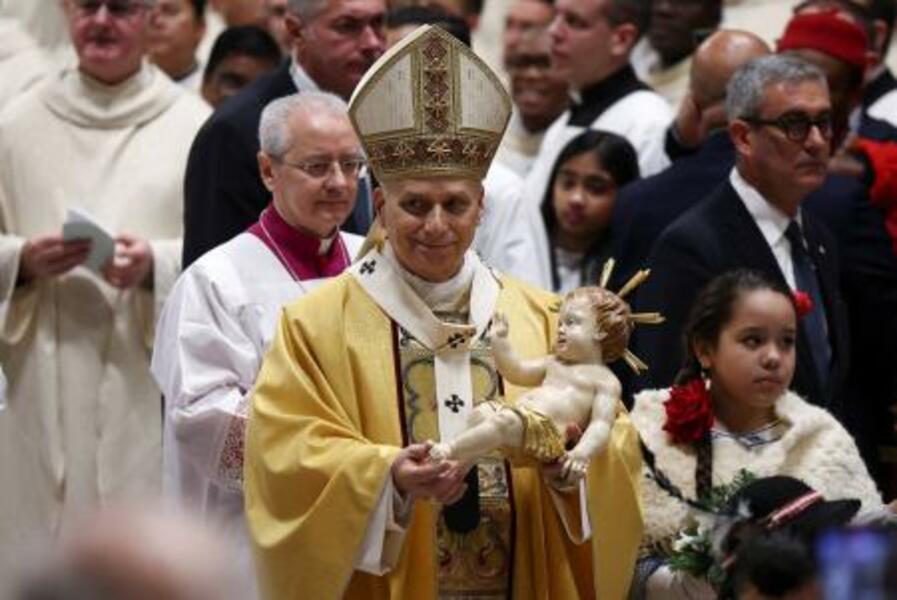 サンピエトロ大聖堂で執り行われたクリスマスイブのミサで、赤ちゃんのキリスト像を抱くローマ教皇レオ14世=24日、バチカン(ロイター=共同)