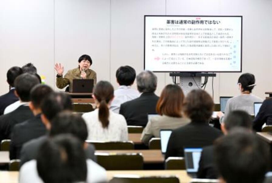 薬害エイズ訴訟の和解成立から30年を前に、厚労省で講演するHIV感染被害者の花井十伍さん=25日午後