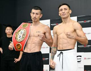 IBFフライ級世界戦の前日計量を終え、ポーズをとる王者の矢吹正道(左)と挑戦者のフェリックス・アルバラード=26日、愛知県国際展示場