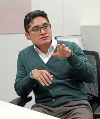 取材に答えるミラノ・コルティナ冬季五輪組織委のサッフィオティ氏=イタリア・ミラノ(共同)