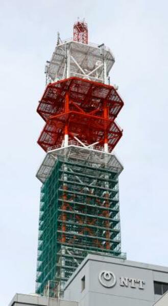 修復工事が完了した「NTT青森八戸ビル」屋上の鉄塔=26日午前、青森県八戸市