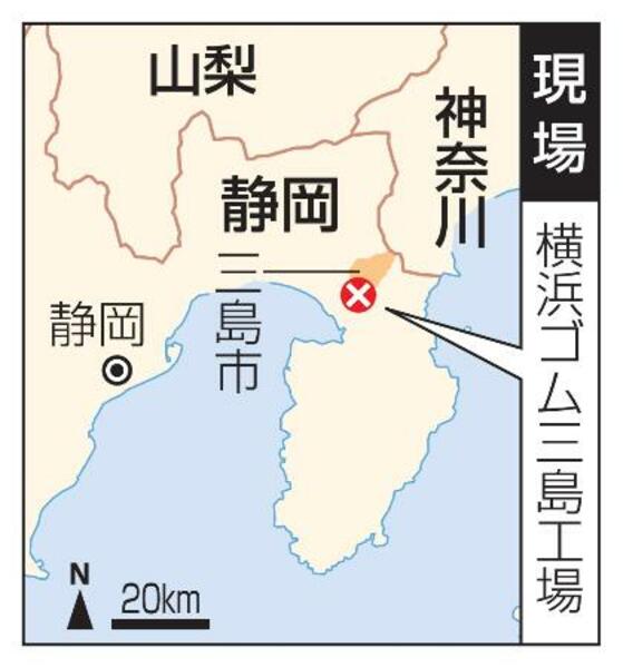 事件のあった横浜ゴム三島工場の出入り口付近=26日午後6時39分、静岡県三島市