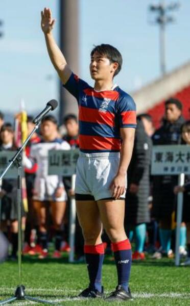 第105回全国高校ラグビー大会の開会式で、選手宣誓する関西学院の西浦章博主将=27日、大阪府東大阪市の花園ラグビー場
