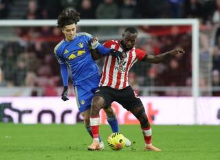 サンダーランド戦で前半31分からプレーしたリーズの田中碧(左)=28日(ロイター=共同)