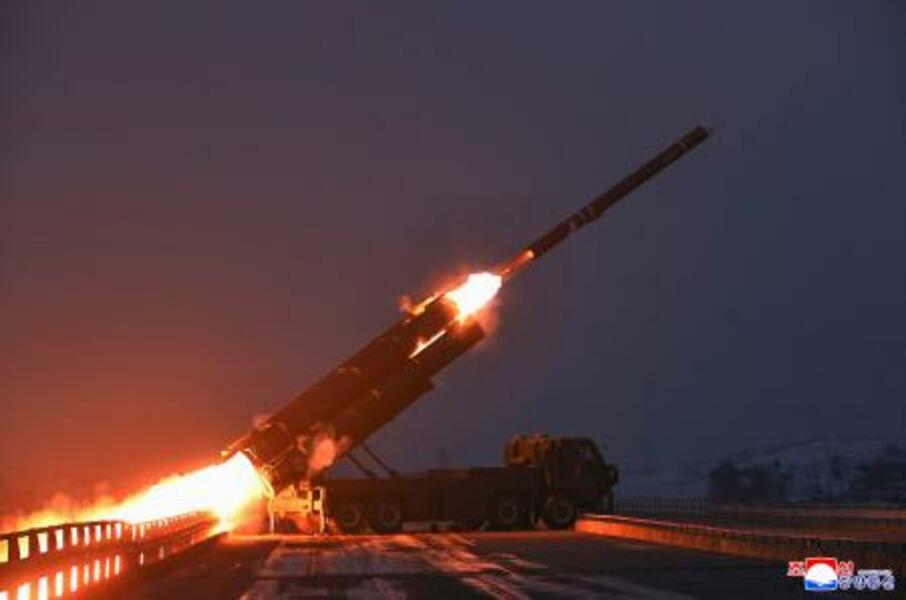 「長距離戦略巡航ミサイル」の発射訓練=28日(朝鮮中央通信=共同)