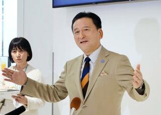 国交省の水嶋智事務次官との会談後、取材に応じる佐賀県の山口祥義知事=29日午後、佐賀空港