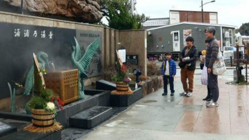 石川県七尾市の和倉温泉を家族と観光する飯島進介さん(右)=2日午後