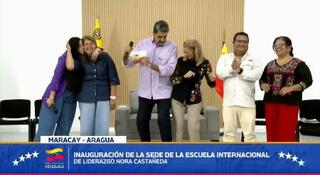 ベネズエラ北部アラグア州で女性向け教育機関の開所式に参加し、踊りを披露するマドゥロ大統領(中央左)と妻シリア・フロレス氏(同右)=2025年12月30日(マドゥロ氏のフェイスブックから、共同)