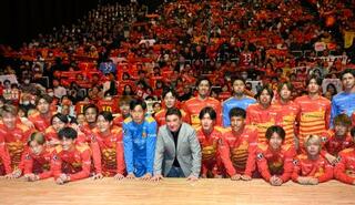 J1名古屋の新体制発表会で、サポーターと記念写真に納まるペトロビッチ新監督(中央)と選手たち=8日、名古屋市