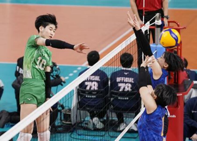 八王子実践―西彼杵 第1セット、スパイクを決める八王子実践・大雲(左)=東京体育館