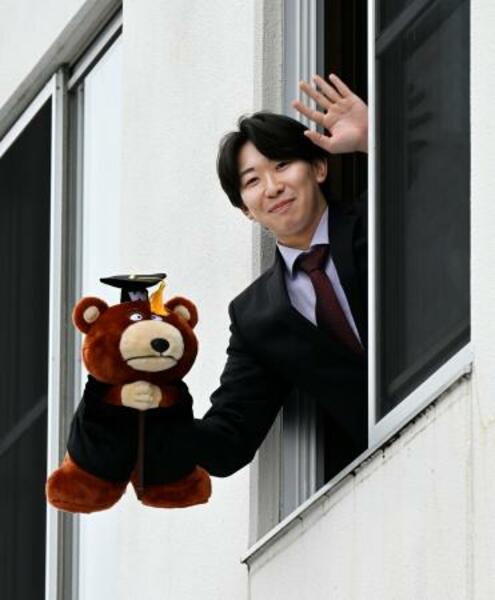 楽天の寮に入り、自室から手を振る伊藤樹=5日、仙台市