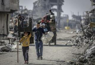 ガザ地区を歩くパレスチナ人の家族=21日(ゲッティ=共同)