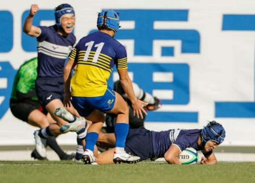 京都成章―桐蔭学園 前半、トライを決める桐蔭学園・曽我=花園