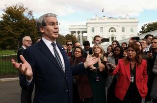 昨年10月、米ワシントンのホワイトハウスで記者らに応じるベセント財務長官(ロイター=共同)