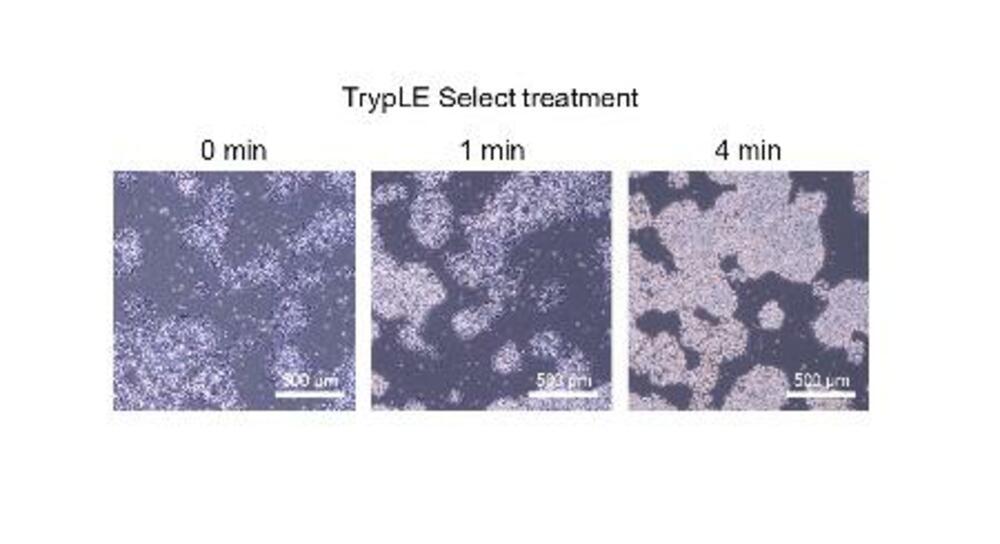 酵素処理により細胞間の結合が弱まる様子(左から右へ)を示すiPS細胞の顕微鏡画像((C)2025 Elsevier B.V. All rights are reserved, including those for text and data mining, AI training, and similar technologies.)