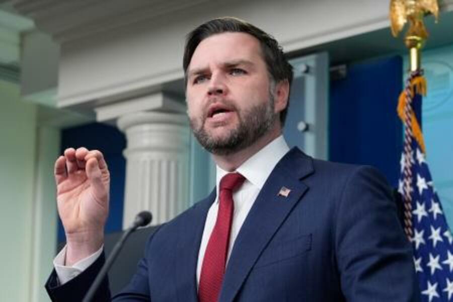 米ホワイトハウスで記者会見するバンス副大統領=8日、ワシントン(AP=共同)