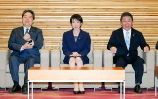 閣議に臨む(左から)林総務相、高市首相、茂木外相=9日午前、首相官邸