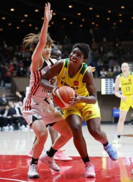 トヨタ自動車―ENEOS 第2クオーター、攻め込むENEOS・馬瓜(右)=代々木第二体育館