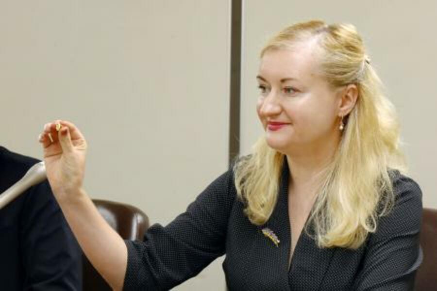 外国法事務弁護士のバッジを手にするイリーナ・ウリバチョバさん=2025年10月、東京・霞が関の司法記者クラブ