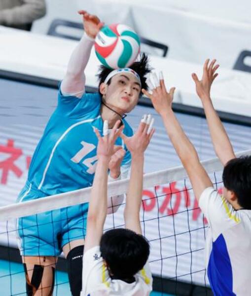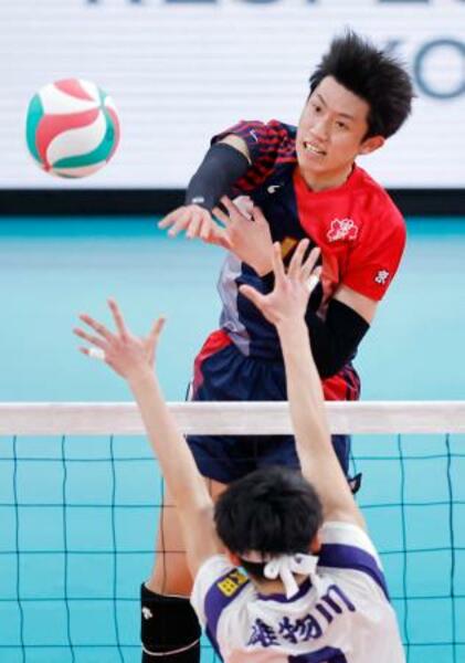 駿台学園―清風 第4セット、スパイクを放つ清風・西村=東京体育館