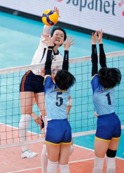 金蘭会―東九州龍谷 第4セット、スパイクを決める金蘭会・馬場=東京体育館