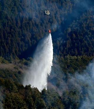 延焼が続く山梨県上野原市の扇山で、消火活動を行う陸上自衛隊のヘリコプター=12日午前10時5分(共同通信社ヘリから)